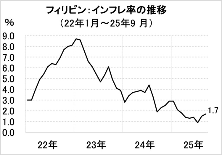 CPI上昇率は、フィリピン中央銀行(BSP)の事前予測(1.5~2.3%)の範囲に収まり、政府インフレ目標(2.0~4.0%)の下限を6カ月連続で下回っている。一部食品とエネルギーを除くコア指数は2.6%で、前月から0.1ポイント低下した。