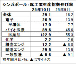 シンガポール:10月の工業生産29%増、医薬が急伸・電子は3割増