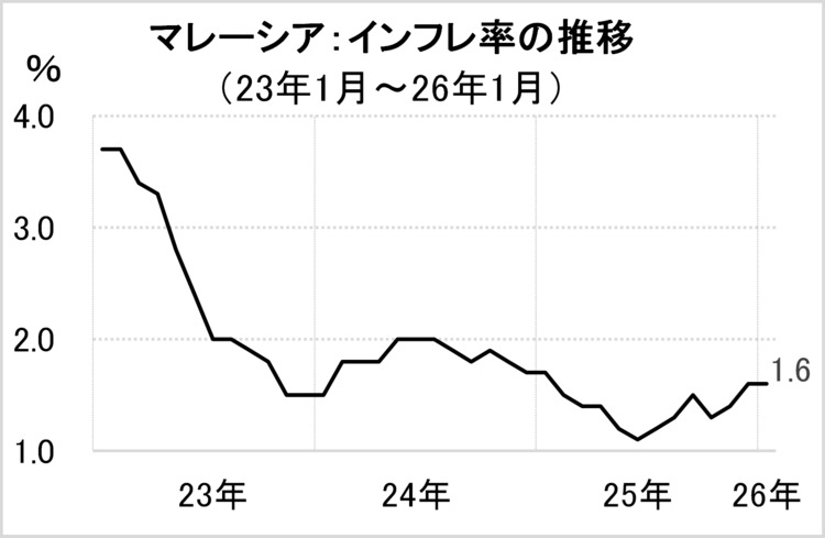マレーシア:1月の物価上昇1.6%、横ばいで低水準維持