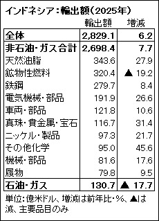 非石油・ガスの主要10品目の輸出では、24年まで最大輸出品だった石炭など鉱物性燃料が19.2%減少。他の9品目は増加し、パーム油を含む天然油脂が27.9%増えて鉱物性燃料を上回る最大輸出品目となった。