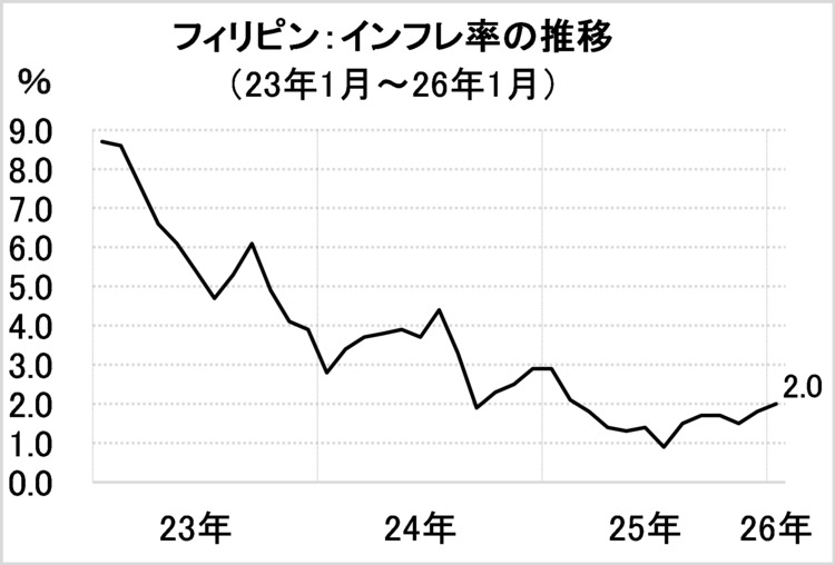 CPI上昇率は、フィリピン中央銀行(BSP)の事前予測(1.4~2.2%)の範囲に収まり、政府インフレ目標(2.0~4.0%)の下限だった。一部食品とエネルギーを除くコア指数は2.8%で、前月(2.4%)から加速した。