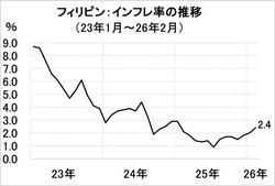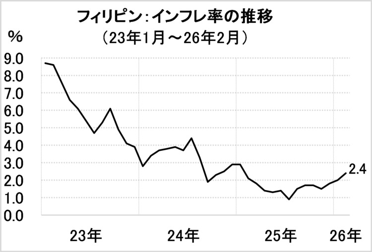 CPI上昇率は、フィリピン中央銀行(BSP)の事前予測(2.3~3.1%)と政府インフレ目標(2.0~4.0%)の範囲に収まった。一部食品とエネルギーを除くコア指数は2.9%で、前月(2.8%)から加速した。