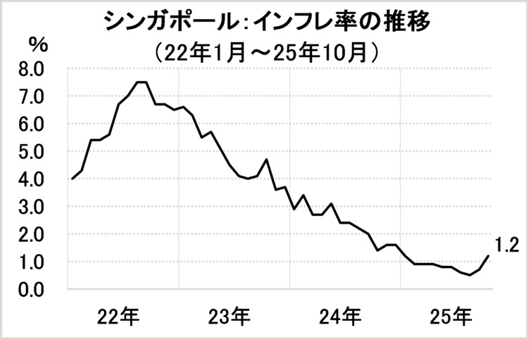 シンガポール金融管理庁(MAS)と貿易産業省は、今後も輸入インフレの緩和が続くうえ、国内では政府による補助金の拠出でサービス分野の値上がりが抑制されるとみている。25年のCPI上昇率予測は0.5~1.0%とし、前月の予測(0.5~1.5%)から上限を引き下げた。コア指数の予測は前月に「0.5%前後」へと下方修正しており、今回は据え置いた。26年の予測も据え置き、CPI、コア指数とも0.5~1.5%に加速すると見込む。